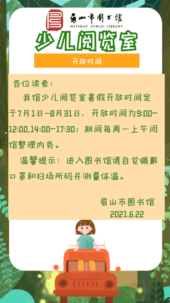 眉山市图书馆暑假少儿阅览室开放时间来了!