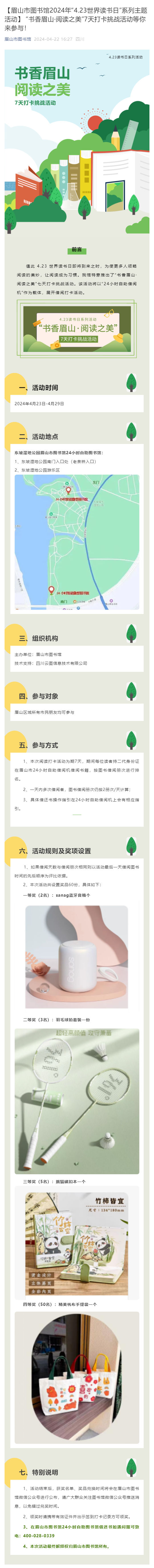 【眉山市图书馆2024年“4.23世界读书日”系列主题活动】 “书香眉山·阅读之美”7天打卡挑战活动等你来参与!