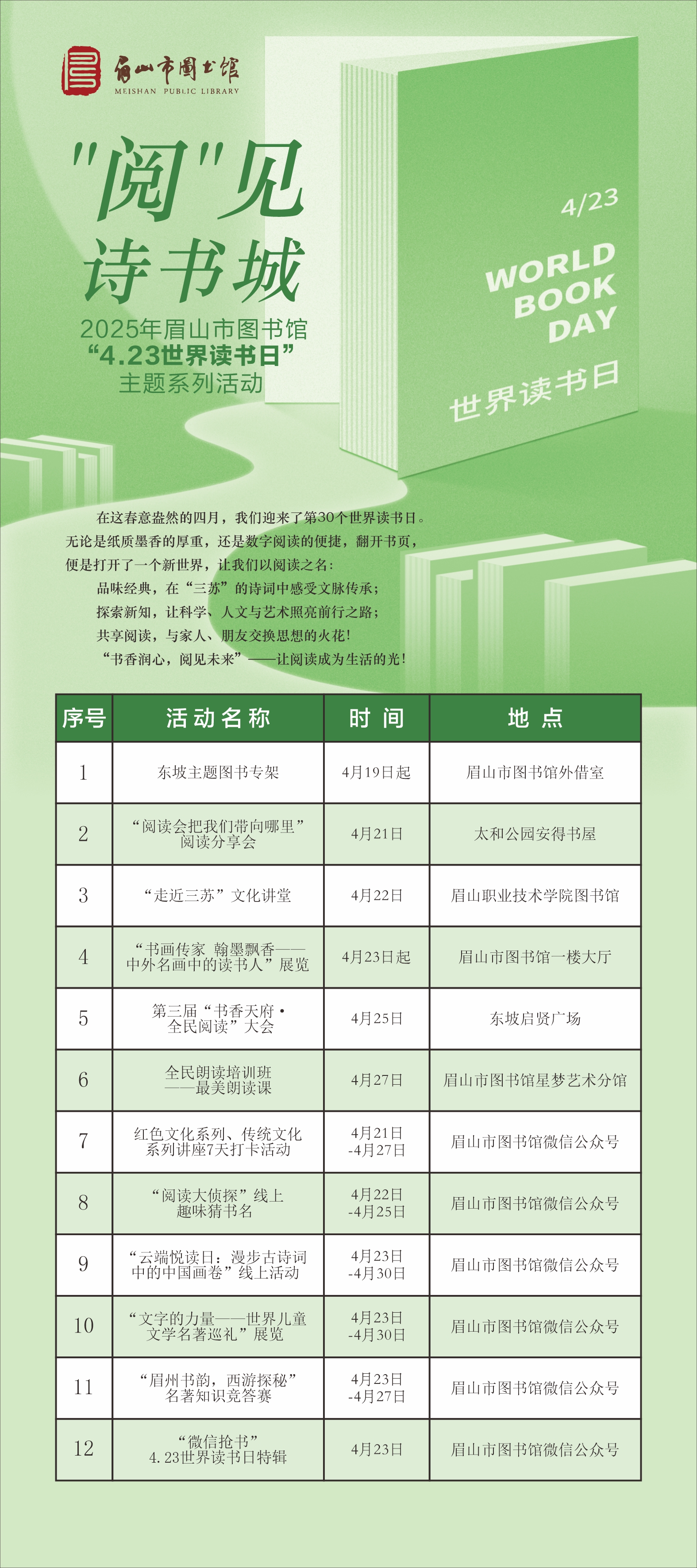 【“4.23世界读书日”主题系列活动】“阅”见诗书城2025年眉山市图书馆“4.23世界读书日”主题系列活动