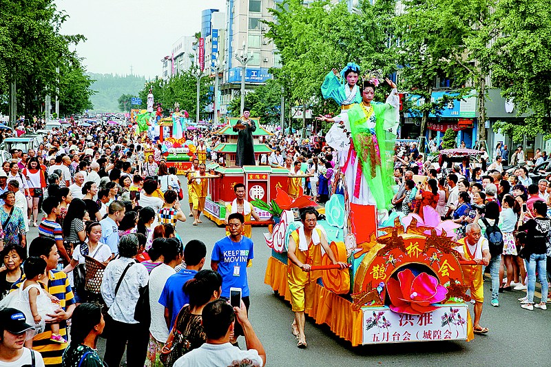 五月台会起源于“娱神自娱”的“酬神赛会”民俗。是从原始古老的“地会”和“灯会”发展演变而来的。洪雅建县于隋开皇十三年(593年),其时民间灯会、地会风俗已相当盛行。据洪雅民间记载,明代著名工匠王光斗设计出一个既是灯又是戏的、能够移动的小戏台造型,找个娃娃来扮演剧中角色,按剧情需要来布置灯景,然后抬着游街,便于群众观赏,艺人群起响应。此法既方便又简单,不需花很多钱,就可以满足人们的精神需求。因此,“台会”应天顺人地兴盛起来。“届时商贾辐奏、货物云集,台会每日傍晚出巡,自一日至十日方罢。”不仅促进了地方文化、经济的发展,而且增进民族团结和融合的进程。世代传承,形成了浓厚的地方民俗文化。明清以后,每逢城隍会(五月台会),各场镇竞相奉献自己最拿手的台会节目。“五月二十七,传城隍神诞,皆演剧,极为繁嚣”。2009年被省政府公布为省级非物质文化遗产名录。